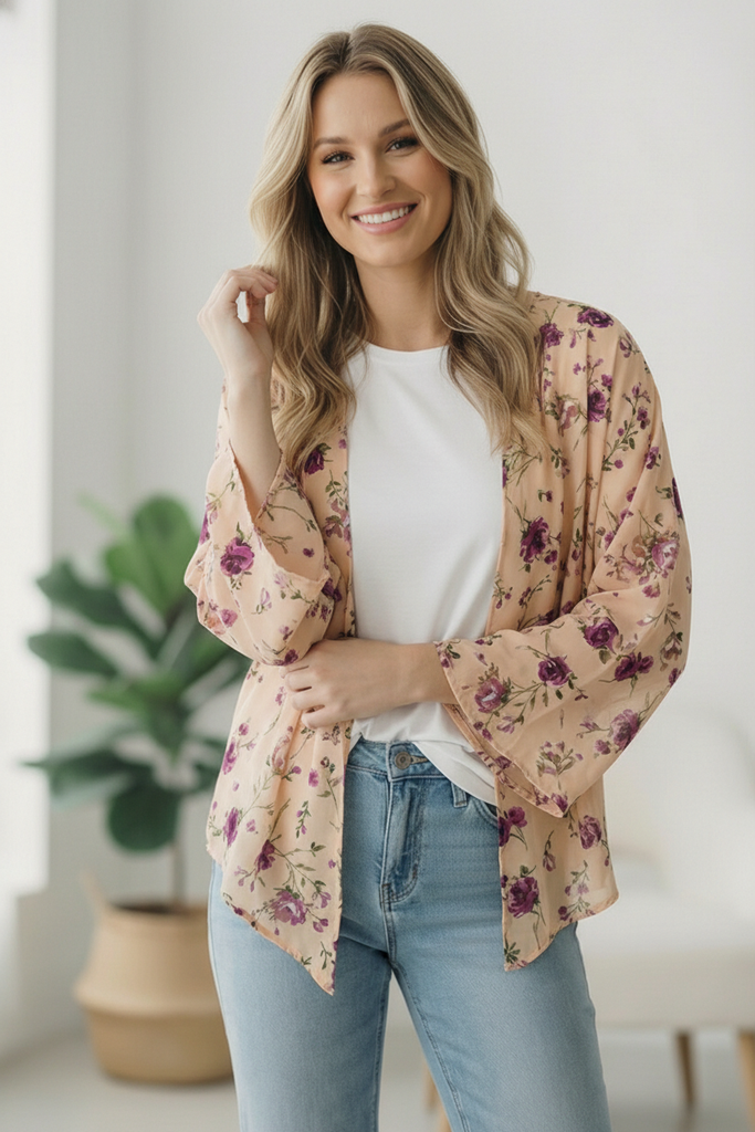 A lightweight layering piece that adds effortless charm to any outfit, this floral kimono features a soft, flowy silhouette with an open front design that drapes beautifully. The delicate floral print brings a feminine touch, making it easy to pair over a simple tee or tank with denim for a polished, everyday look. Perfect for layering through changing seasons, this versatile piece transitions seamlessly from casual daytime outings to relaxed evenings out, making it a must have staple for any wardrobe.