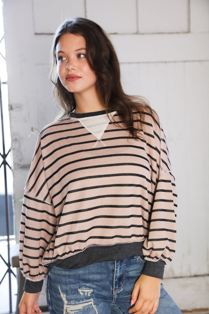 We love this oversized crew neck. The french terry fabric feels like heaven and we love the triangle detail on the front. The charcoal contrast on the back is so fun! You will reach for this one all the time.